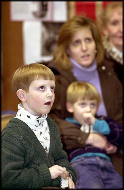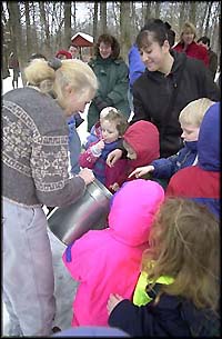Suzzanne Mahoney, lets the visitors taste the water like sap. (below right) Nicholas Lemere, of Florham Park stands ready to hang the sap bucket.