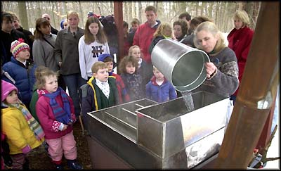 Suzzanne Mahoney, pours the sap into the evaporator. It takes about 40 gallons of this clear liquid to boil down to 1 gallon of syrup. (left)