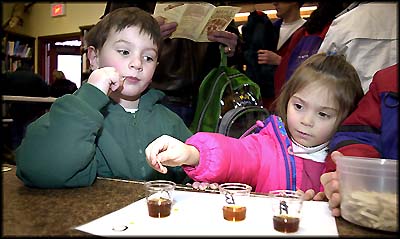 (l-r) Nicholas Caoazza, of Montville and Caroline Ellwood, of Cranford take the ultimate taste test. Which one is better? (l-r) C) Vermont Maple Syrup; B) Great Swamp Maple Syrup; or A) off the shelf pancake syrup, which is mostly corn syrup. The Kids picked B and C.