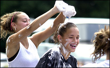 Teammates get together for teamwork. (below left) Rachel Patterson, ducks the spray of water as she soaps up a car.