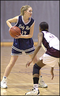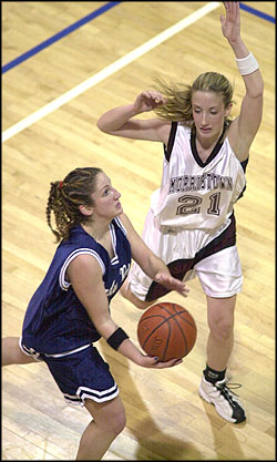 (left) Randolph #14 Laura Gubitosa; is guarded by Morristown #21 Catherine Haggarty.