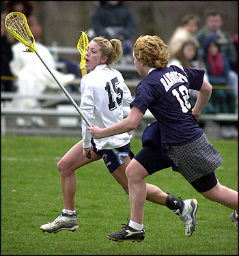 Friday April 5. (above) WMC #11 Courtney Tapkas, ducks under Randolph #11 Carrie Zensinger. (right) WMC #15 Brooke Wilson, works her way around Randolph #12 Courtney Gugluizza.