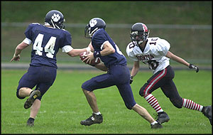 Chatham #44 Chris Betz, gets all over the field, as he sets up to put a block on Mountain Lakes #10 Anthony Fleres; to spring his teammate #80 Will Denchek