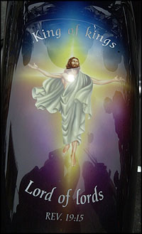 right) Fr. Mark, a biker himself arrives to celebrate mass. (above left) A detail view of a painting of Christ on Fr. Marks new bike. (left)