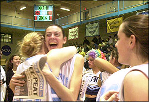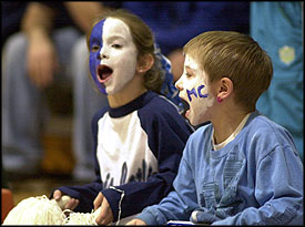 (above left) MC #33 Megan Eckerd and #42 Tara Kelly celebrate at games end. (above right) Two young Morris Catholic fans catch the fever.