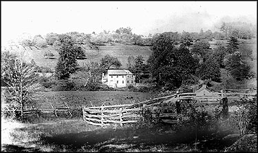 The Knuths harvested and sold apples and peaches until the orchards were no longer productive. They operated a distillery in the carriage house, where beer, brandy, and wine were made on-site. A well and windmill provided the farm's original water source. Then, a German laborer employed during World War I (from 1917 to 1918), designed and installed a rife ram water system. A hydraulic pump in the stone springhouse (near Route 10) used the water flow of the adjoining stream to pump water to a 5,000-gallon storage cistern at the crest of the property. When needed, water flowed downhill to the farm buildings. The laborer's abrupt disappearance at the war's end sparked rumors that he was a German spy. Martin and Anna, however, were loyal Americans who became naturalized citizens by 1920. When Martin Knuth died in 1935, the prosperity his family enjoyed for 30 years soon followed. In August 1936, an intense fire claimed the barn. Here, Anna Knuth (right) stands with her sister in front of the tree that shielded her home from the burning embers of the barn fire.