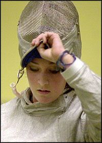 Andrew Connors, of Morris Knolls, faces Mike Zeller, of Morris Hills. (below right) Lindsey Dicks, of Morris Knolls, removes her mask after a match. |