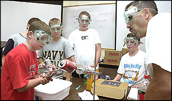 Science Instructor Joe Benvenuto, conducts an experiment where the students crush a can with steam.