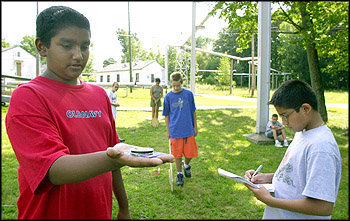 Ricky Thumar, takes compass readings as teammates Shane Aruzza, measures off the meters and Malay Amin, records their moves during an orienteering exercise. (right)