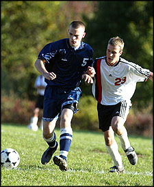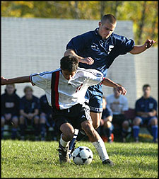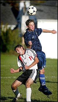 Boonton - 10/22/02 (above left) Mountain Lake's John Dolny goes up for a header over Boonton's Eslam Zidan. (above right)