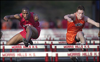 Morris Hills Brian Smith, finishes first in the 100 meter hurdels with a 15.2 run over Dover's Mike Steffen, with a 15.5 run. (right) Mount Olive's Josh Adieyefh takes to the air on the Long Jump.